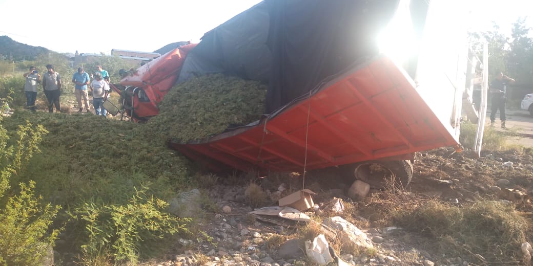 CHILECITO SE PRODUJO UN VUELCO EN PASAJE LA CAÑADA CONTINUACIÓN CON AV. SOBERANÍA NACIONAL PROTAGONIZADO POR UN CAMIÓN MARCA MERCEDES BENZ